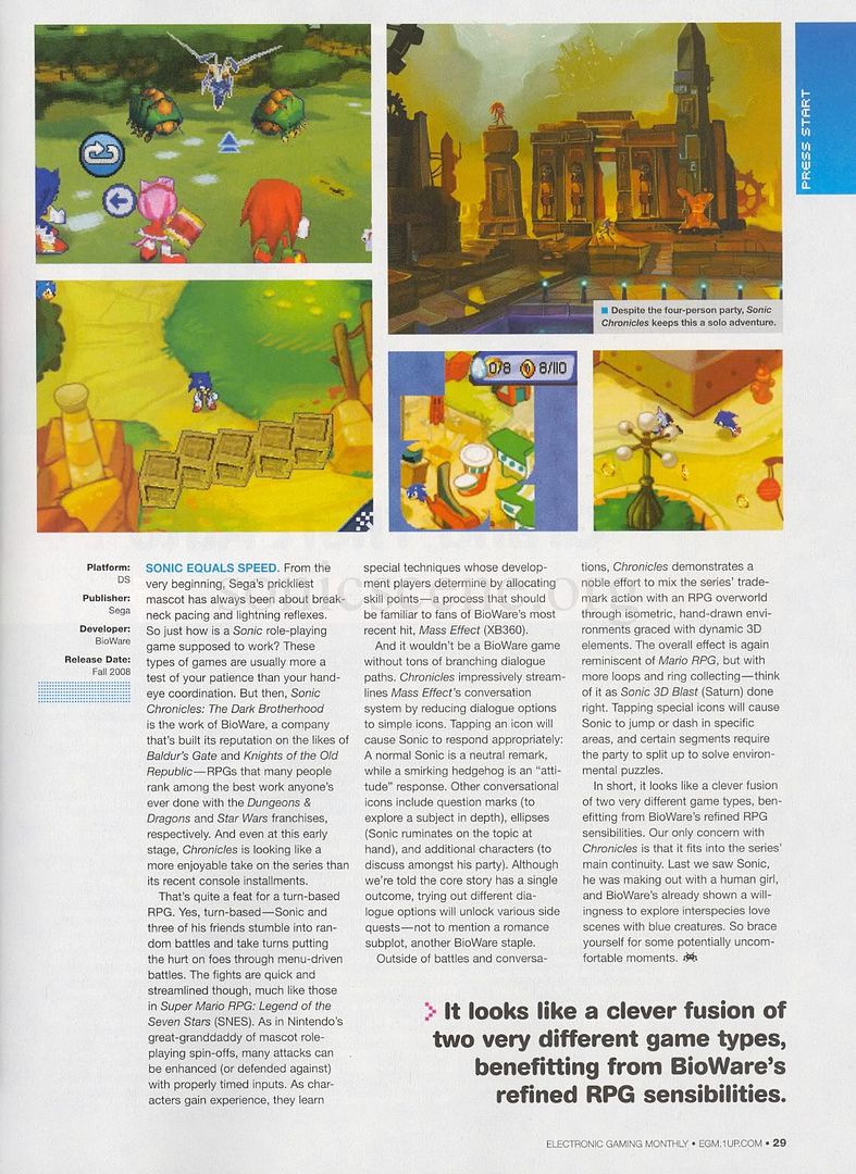 總的說來,看上去這款遊戲將兩種不同的遊戲類型巧妙地結合在了一起,這要歸功於BioWare對RPG遊戲精妙的理解。我們對歷代記唯一抱有的擔憂就是它與Sonic系列前作的連貫性。上一次Sonic登場的時候,他正在拯救一位人類少女,而BioWare也表現出極大的興趣,來研究這只藍色刺猬與不同種類的動物們之間的曖昧關係,所以,請做好心理準備。