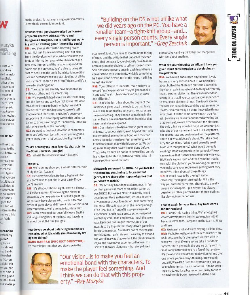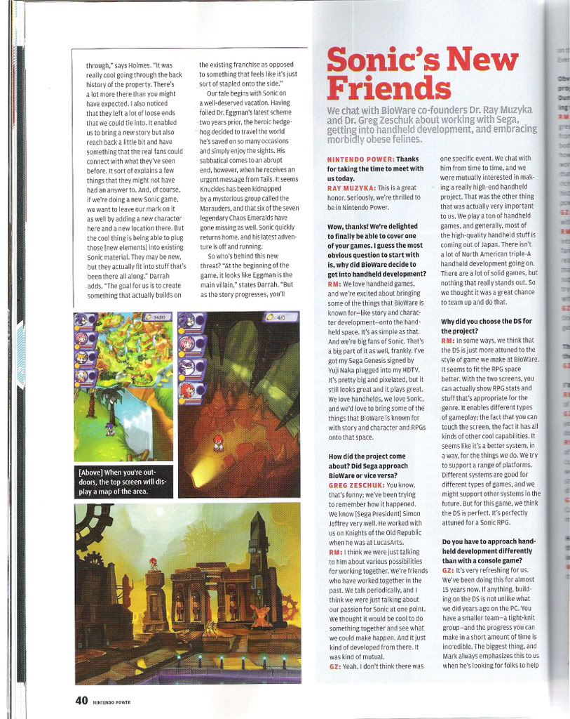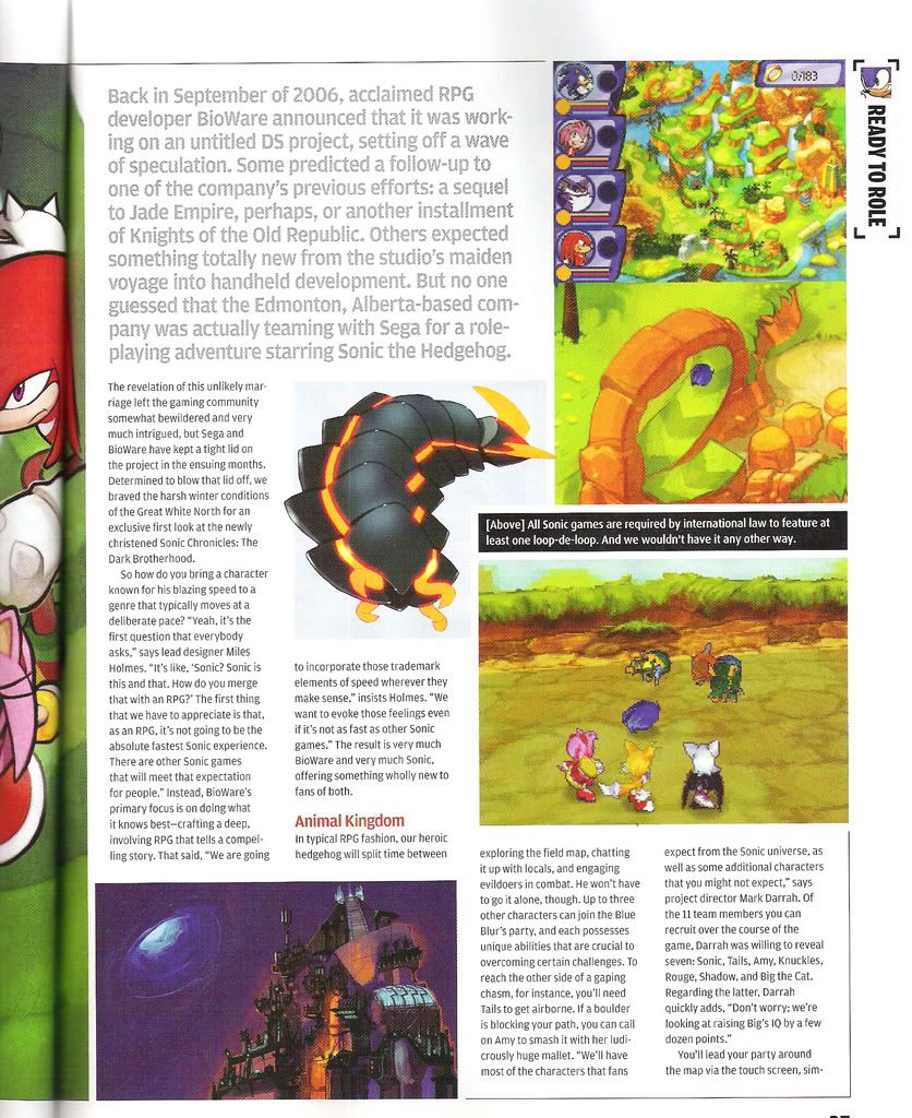 回到2006年9月,久負盛名的RPG開發公司Bioware宣佈他們正在製作一款尚未定名的DS遊戲,引發了一輪密切關注。有些人預測將會是公司前作的續集:例如下一代的 翡翠帝國 ,或者是 舊共和國武士 的移植版本。其他人則十分期待製作公司的首次掌機作品。但所有人都沒想到這個位于加拿大Alberta省Edmonton的公司事實上是在與SEGA合作一款角色扮演類的音速小子遊戲。